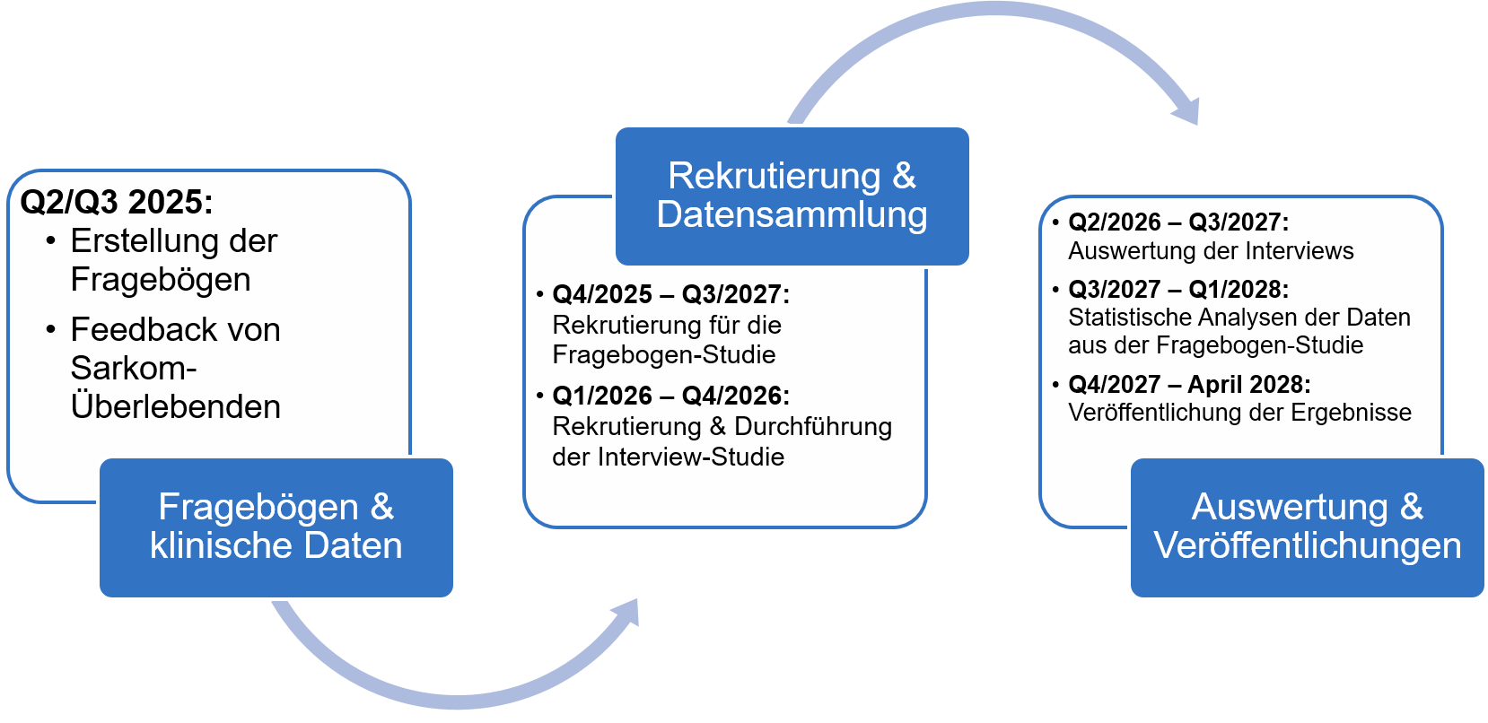 Auftakt für Prosa+ war im Mai 2025. In einem ersten Schritt erarbeitete ein interdisziplinäres Team die unterschiedlichen Themen, die in dem Fragebogen abgedeckt werden sollen. Dank des Feedbacks von Sarkomüberlebenden, Fachpersonal aus verschiedenen Bereichen und Patientenvertreter:innen wurde der Fragebogen überarbeitet und finalisiert.